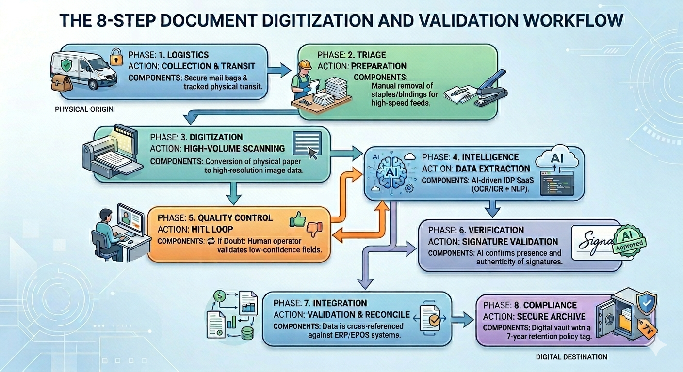 What do we mean by digitisation of paper? In short, we mean the process by which a paper record is turned into a digital image. The required data is extracted from that image to create a useful record of the transaction that can then be stored at much reduced cost and made searchable for when it is needed. Usually, the process will involve the destruction of the paper record.