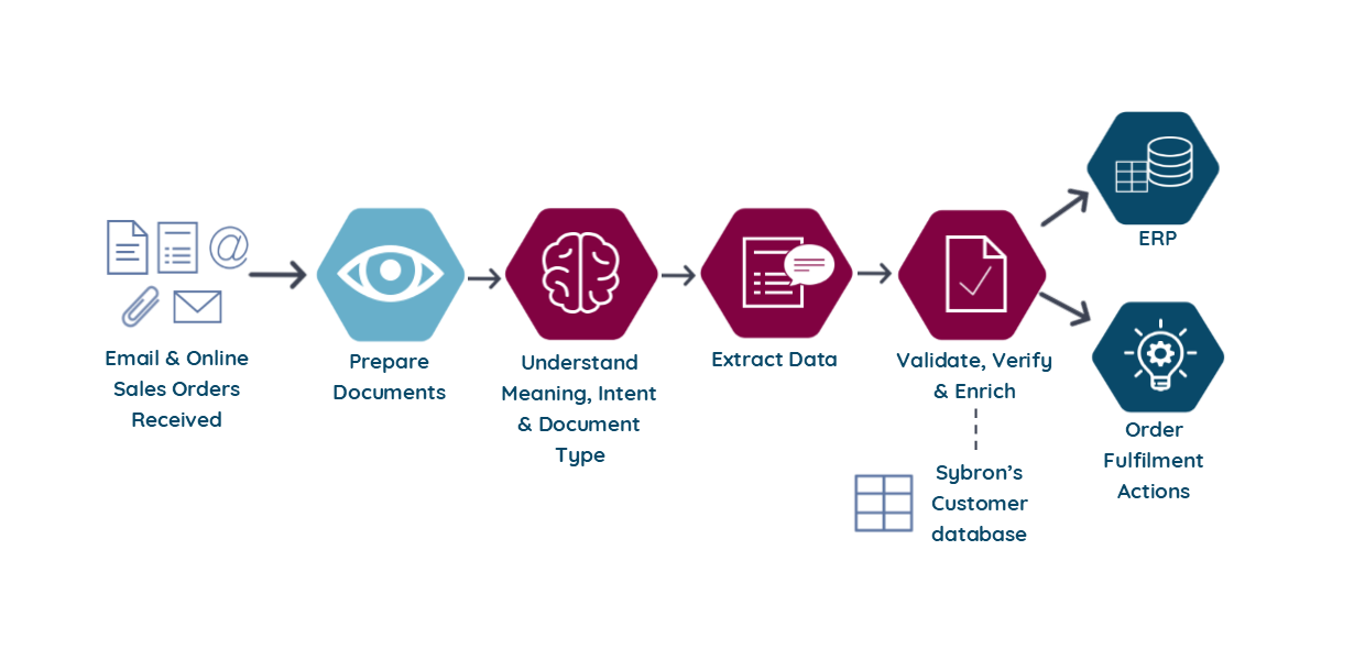 Once all relevant data has been identified, extracted, validated and verified the order details are then delivered to Sybron’s ERP system and enters their order fulfilment and shipping queues for action by other departments.