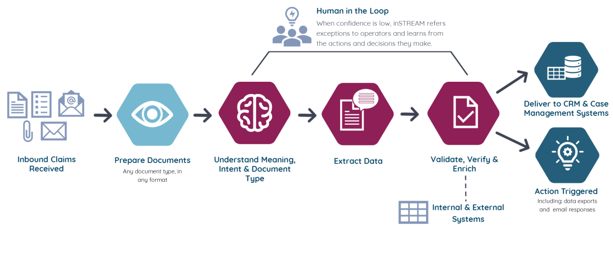 inSTREAM reads and categorises the claim, whilst extracting key data and carrying out further tasks such as validation and verification of case details, identification of suspicious claims and other business checks.